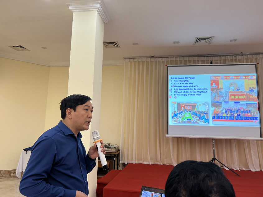 Ông Phạm Văn Quang, Phó Chủ tịch LĐLĐ Thái Nguyên chia sẻ kinh nghiệm triển khai phòng, chống HIV/AIDS trong khu công nghiệp tại Thái Nguyên