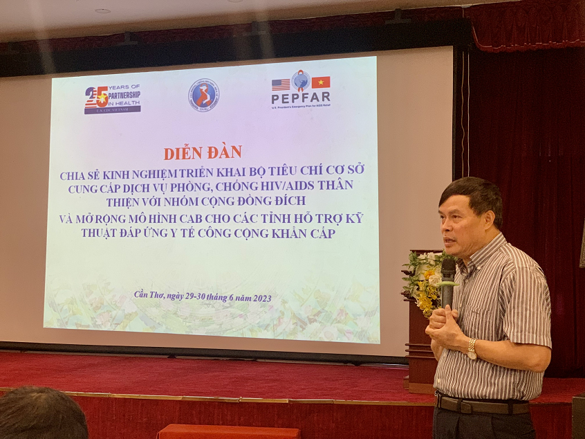 Trong hai ngày 29-30/6/2023, tại thành phố Cần Thơ, Cục Phòng, chống HIV/AIDS đã tổ chức Diễn đàn chia sẻ kinh nghiệm triển khai Bộ tiêu chí cơ sở cung cấp dịch vụ phòng, chống HIV/AIDS thân thiện với nhóm cộng đồng đích và mở rộng mô hình CAB cho các tỉnh hỗ trợ kỹ thuật đáp ứng y tế công cộng khẩn cấp.