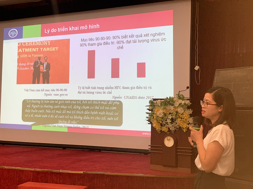 Ths. Phạm Thị Quân, Đại học Y Hà Nội đã có bài chia sẻ Kinh nghiệm triển khai thí điểm Bộ tiêu chí cơ sở cung cấp dịch vụ phòng, chống HIV/AIDS thân thiện với nhóm cộng đồng đích - thuận lợi, khó khăn thách thức và bài học kinh nghiệm. Mô hình đã được triển khai thí điểm tại 03 tỉnh/thành phố: Thái Nguyên, Hải Phòng và Hà Nội.