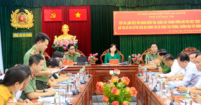 Đoàn công tác Trung ương đã đánh giá cao công tác phòng, chống tội phạm, ma túy trên địa bàn tỉnh An Giang trong thời gian qua. Đồng thời, đề nghị tỉnh tiếp tục triển khai thực hiện hiệu quả Chỉ thị 36-CT/TW của Bộ Chính trị. Trong đó, đẩy mạnh công tác tuyên truyền, phổ biến các chủ trương của Đảng, chính sách, pháp luật của nhà nước về phòng, chống ma túy, các phương thức, thủ đoạn hoạt động của tội phạm với nhiều hình thức đa dạng, thiết thực. Cùng với đó, phát huy sức mạnh của cả hệ thống chính trị, sự tham gia tích cực của các cấp, các ngành, đoàn thể và nhân dân trong công tác phòng ngừa, đấu tranh với tội phạm, tệ nạn ma túy, trong đó lực lượng công an giữ vai trò nòng cốt...