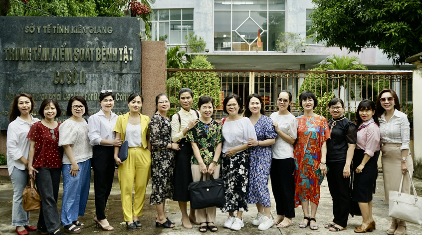 Đoàn phóng viên chụp ảnh lưu niệm cùng cán bộ Trung tâm kiểm soát bệnh tật tỉnh Kiên Giang