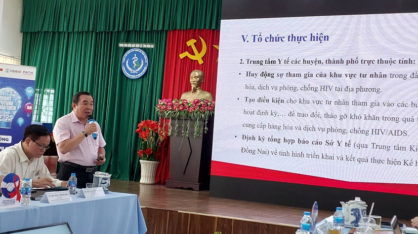 Thay mặt Trung tâm Kiểm soát bênh tật tỉnh Đồng Nai, Bs Nguyễn Xuân Quang, Trưởng khoa phòng, chống HIV/AIDS đã trình bày Kế hoạch tăng cường sự tham gia của khu vực tư nhân trong đầu tư và cung cấp các dịch vụ phòng, chống HIV/AIDS giai đoạn 2023-2035 trên địa bàn tỉnh Đồng Nai. Mục tiêu cụ thể đến 2025 tăng thêm 30% số doanh nghiệp xã hội, phòng khám và đối tác tư nhân tham gia vào các hoạt động phòng, chống HIV/AIDS; Hoàn thiện công cụ theo dõi, triển khai, giám sát, cơ chế chia sẻ thông tin, đánh giá, kiểm tra sự tham gia của khu vực tư nhân trong đầu tư và cung cấp dịch vụ phòng, chống HIV/AIDS. Để đạt được mục tiêu này, nhiều hoạt động và mô hình sẽ được thí điểm và triển khai tại tỉnh Đồng Nai bao gồm nâng cao năng lực cho khu vực tư nhân đầu tư và cung cấp hàng hóa, dịch vụ phòng, chống HIV/AIDS; Đánh giá và nhân rộng các mô hình hiệu quả do khu vực tư nhân cung cấp; Thiết lập hệ thống theo dõi, đánh giá. Nhiều phương thức phối hợp như thảo thuận hợp tác giữa các bên; Tổ chức ký kết các hợp đồng cung cấp dịch vụ; Tổ chức các cuộc họp định kỳ trao đổi thông tin và thúc đẩy hợp tác sẽ được thực hiện trong kế hoạch này.