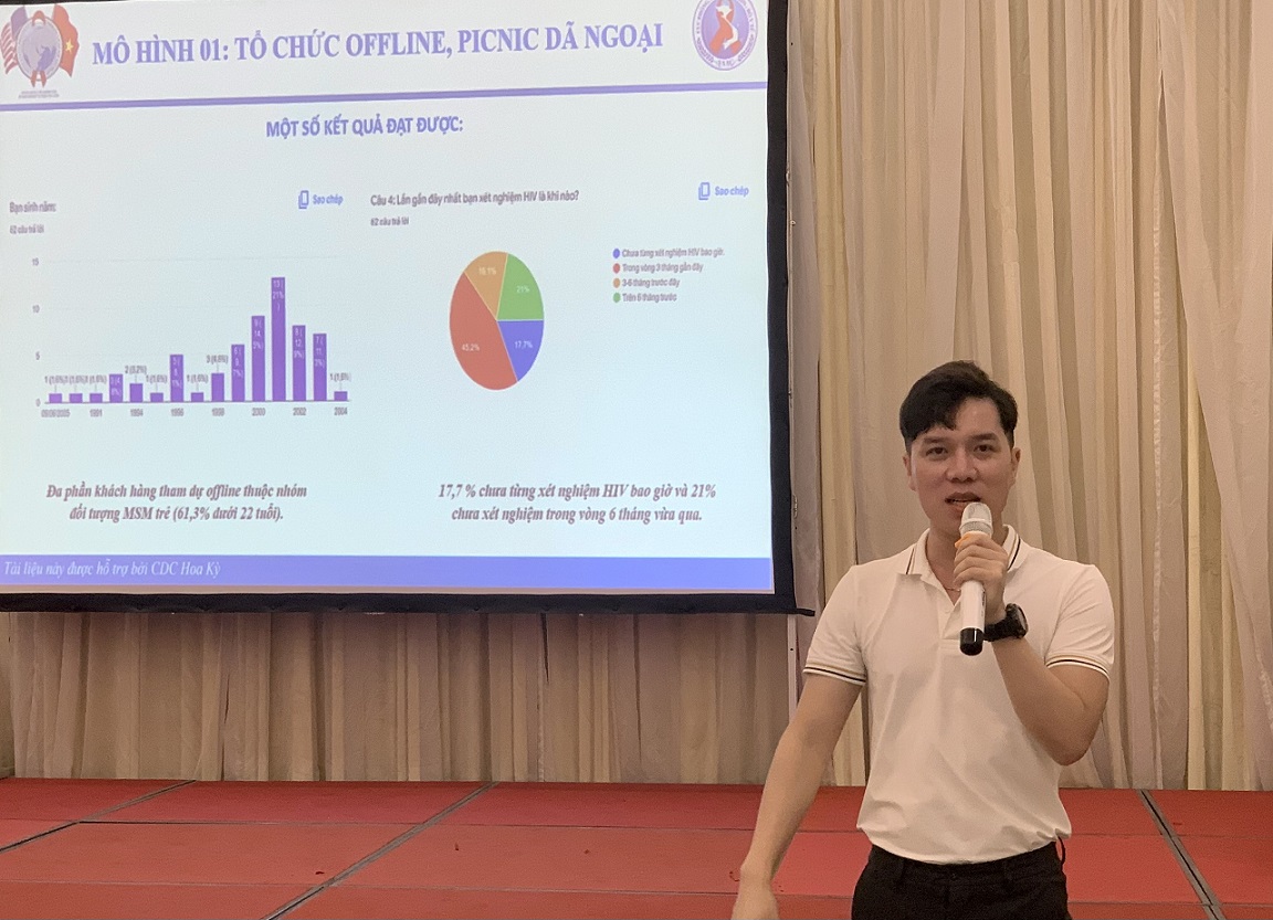 TS. Nguyễn Thị Minh Tâm, Trưởng phòng Dự phòng lây nhiễm HIV trình bày về tình hình lây nhiễm HIV trong cộng đồng MSM và các yếu tố làm tăng nguy cơ lây truyền HIV trong nhóm MSM/TG hiện nay. Tại bài trình bày, TS. Tâm cảnh báo tình hình dịch HIV tại Việt Nam có xu hướng tăng cao trong nhóm nam quan hệ tình dục đồng giới. Tuy Cục Phòng, chống HIV/AIDS đã triển khai nhiều dịch vụ phòng, chống HIV/AIDS như dịch vụ xét nghiệm HIV, điều trị dự phòng trước phơi nhiễm HIV (PrEP trực tiếp, PrEP lưu động, PrEP trực tiếp...), điều trị HIV, cung ứng bao cao su, chất bôi trơn, điều trị các rối loạn tâm thần, điều trị hành vi về lệ thuộc các chất kích thích dạng Amphetamine, khám và điều trị các bệnh lây truyền qua đường tình dục… nhưng với nhiều lí do mà quần thể MSM chưa thể tiếp cận và sử dụng các dịch vụ HIV một cách toàn diện. Việc sử dụng dịch vụ HIV trong nhóm MSM còn hạn chế nên chưa đủ khống chế tình hình lây nhiễm HIV trong cộng đồng.