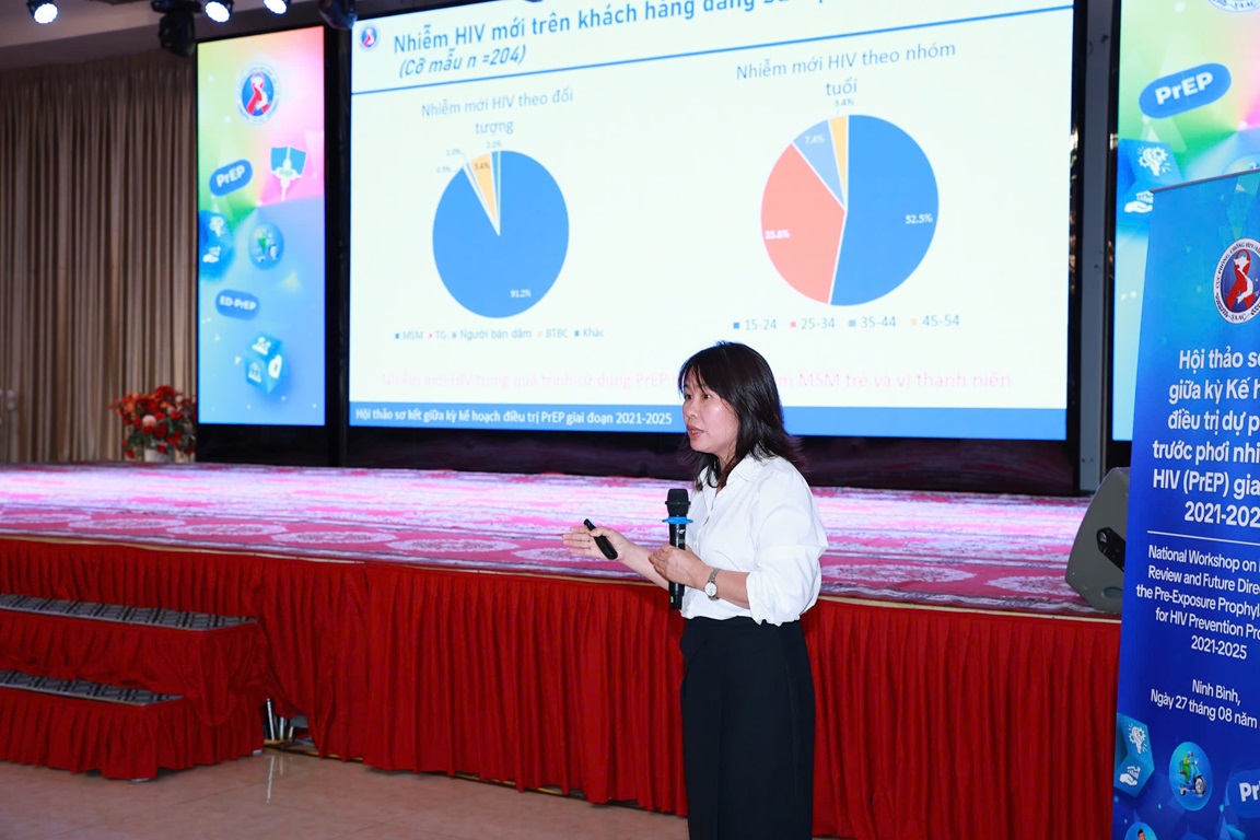 TS. BS. Đỗ Thị Nhàn, Trưởng phòng Điều trị HIV/AIDS trình bày về kết quả điều trị dự phòng trước phơi nhiễm với HIV (PrEP) giai đoạn 2021-2025. Hết quý II/2024, có hơn 112.000 lượt khách hàng sử dụng PrEP ít nhất 1 lần. Với kết quả này, Việt Nam trở thành nước dẫn đầu Châu Á – Thái Bình Dương về số người điều trị PrEP (PrEP uptake), đồng thời PrEP được xác định là một can thiệp ưu tiên để hướng tới kết thúc AIDS vào 2030. Bài học thành công, kinh nghiệm, thực hành tốt về triển khai PrEP của Việt Nam đã được báo cáo, chia sẻ với các quốc gia khác trên các diễn đàn Quốc tế.