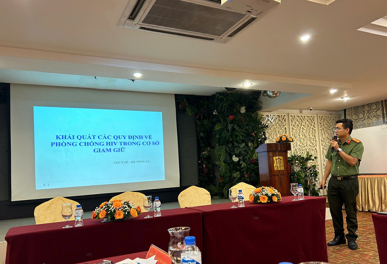 Đồng chí Thiếu tá Nguyễn Đình Vạn, Phó Trưởng phòng 2, Cục Y tế, Bộ Công an trình bày Khái quát các quy định về phòng, chống HIV trong cơ sở giam giữ. Bộ Công an hiện có 54 trại giam và 69 trại tạm giam quản lý trên 200.000 can phạm nhân. Hàng năm, can phạm nhân nhiễm HIV/AIDS trong cơ sở giam giữ luôn chiếm số lượng lớn, tỷ lệ tử vong do AIDS cao ảnh hưởng không nhỏ đến công tác quản lý, giáo dục và chăm sóc y tế cho đối tượng giam giữ.