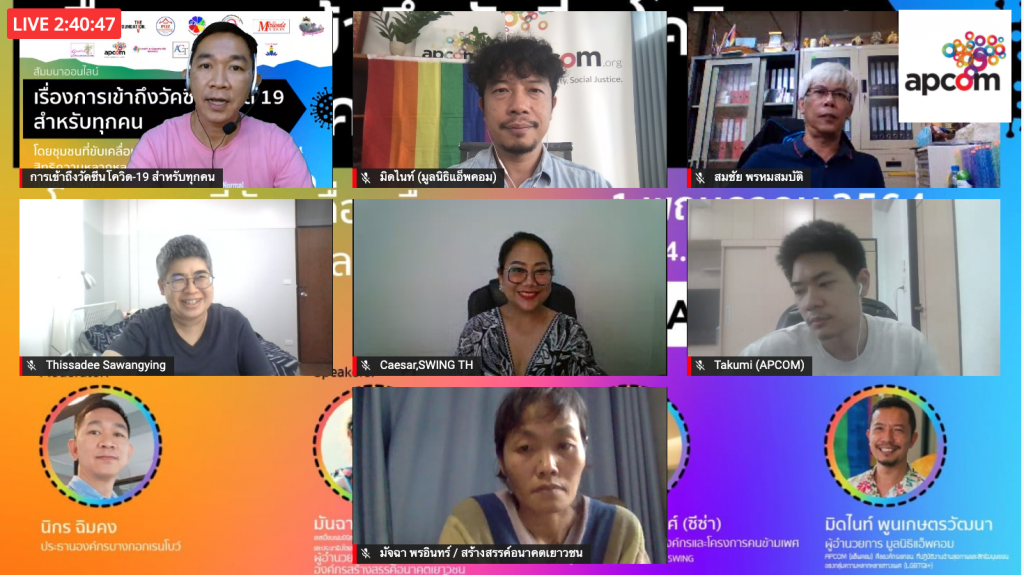 Một chủ đề nóng khi Thái Lan đang trải qua làn sóng thứ ba, đó là việc thiếu khả năng tiếp cận vắc-xin khi số ca nhiễm Covid-19 mới vượt quá 2.000 ca mỗi ngày, gây ra câu hỏi về cách phân phối vắc-xin ở Thái Lan và cộng đồng của chúng ta có làm việc về LGBTQI không vấn đề có tiếp cận công bằng không?