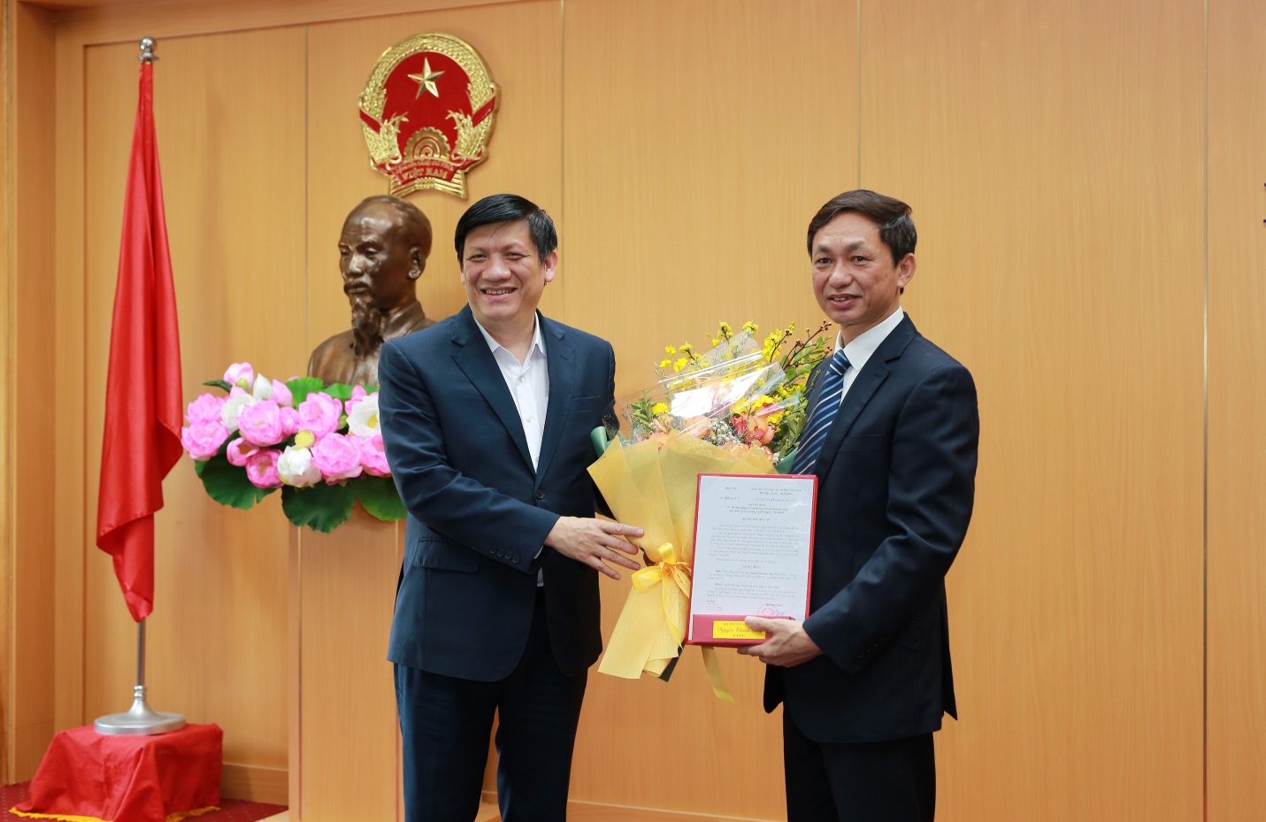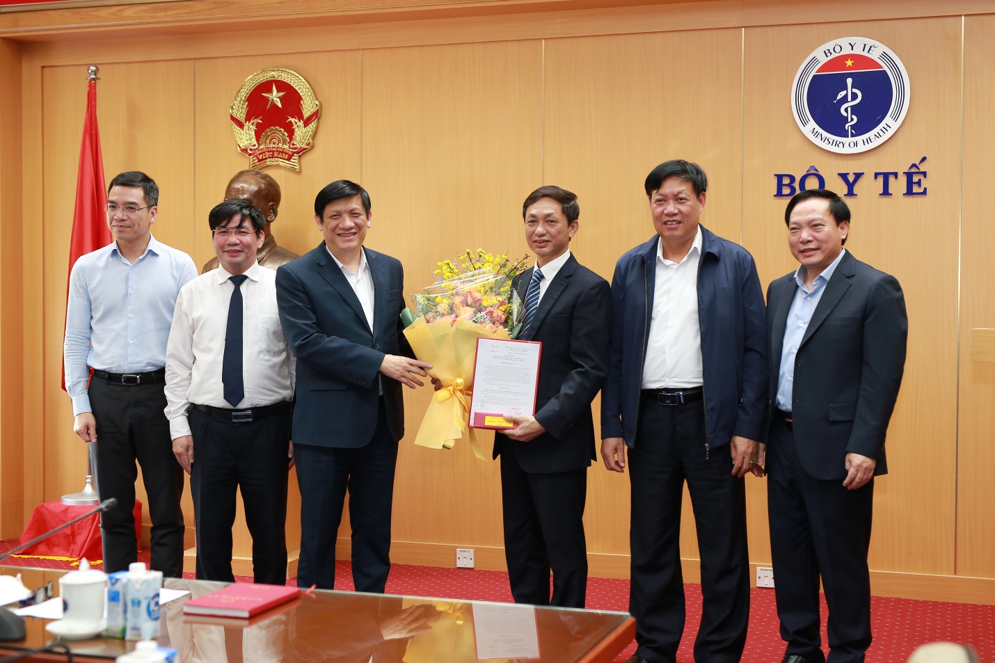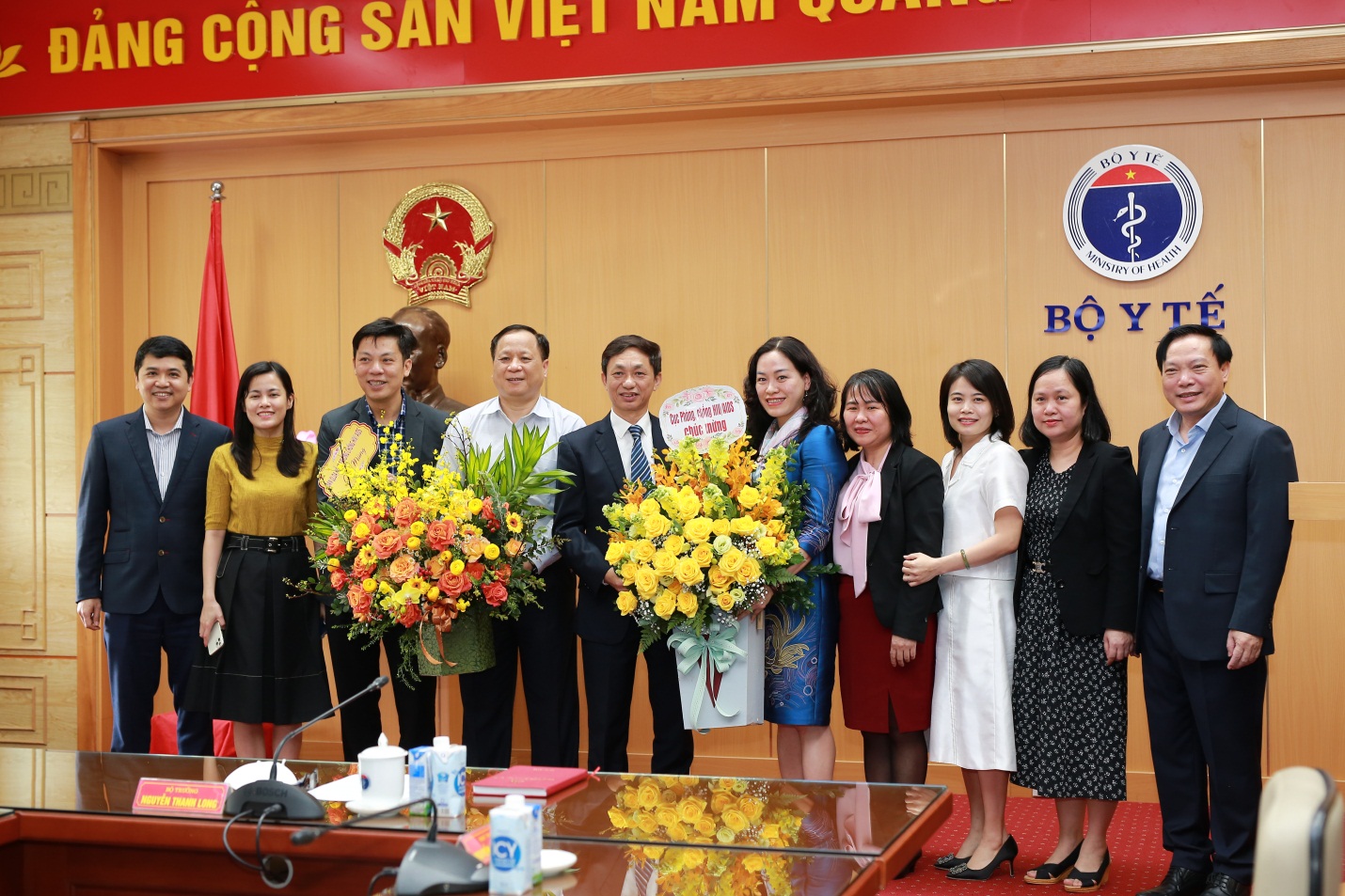 Các đồng chí lãnh đạo Bộ Y tế, Chánh Văn phòng Ban Cán sự Đảng Bộ Y tế, Vụ trưởng Vụ Tổ chức cán bộ, Chánh Văn phòng Bộ Y tế chúc mừng PGS.TS Nguyễn Hoàng Long