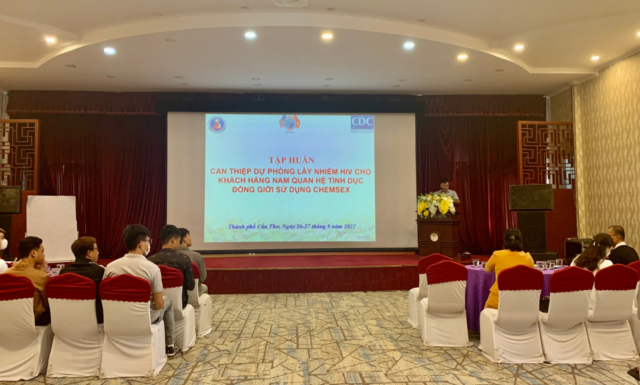 Trong hai ngày 26-27/9/2022, tại Cần Thơ, được sự hỗ trợ của tổ chức CDC Hoa Kỳ, Cục Phòng, chống HIV/AIDS tổ chức khóa tập huấn về truyền thông, can thiệp dự phòng lây nhiễm HIV cho khách hàng nam quan hệ tình dục đồng giới (MSM) sử dụng chất khi quan hệ tình dục (Chemsex) cho các đồng đẳng viên tiếp cận nhóm khách hàng nam quan hệ tình dục đồng giới (MSM) của 05 tỉnh, thành phố có số lượng MSM cao: Sóc Trăng, Cần Thơ, Kiên Giang, An Giang, Đà Nẵng. Giảng viên Khóa tập huấn là các chuyên gia
