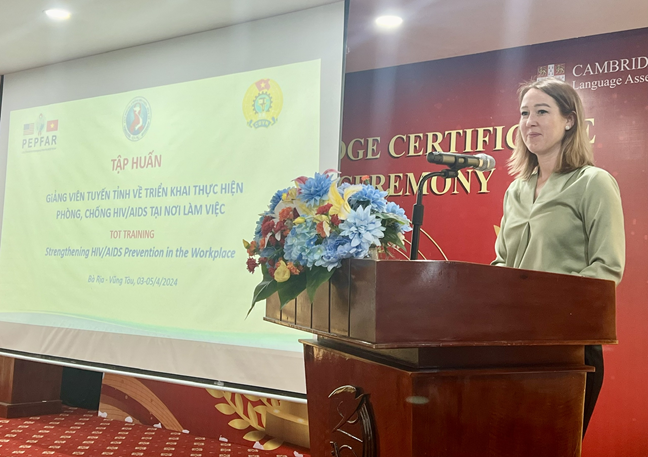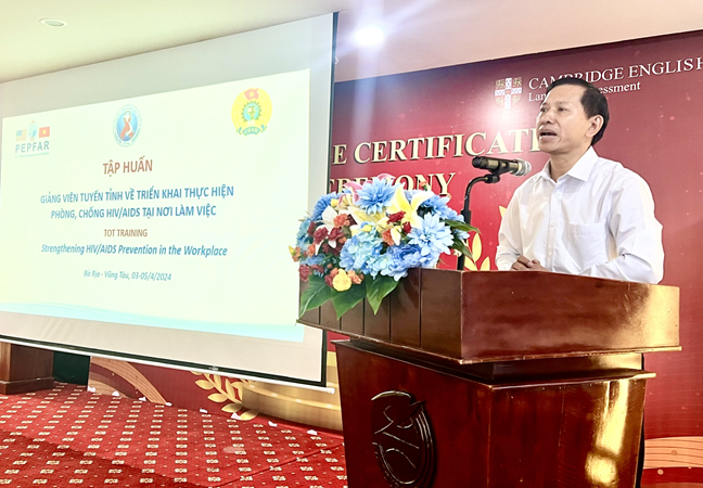 Trong 3 ngày 03-05/4/2024, tại thành phố Vũng Tàu, được sự hỗ trợ của tổ chức CDC Hoa Kỳ, Cục Phòng, chống HIV/AIDS phối hợp với Tổng Liên đoàn Lao động Việt Nam tổ chức khóa tập huấn giảng viên tuyến tỉnh về triển khai phòng, chống HIV/AIDS tại nơi làm việc cho cán bộ y tế/cán bộ công đoàn tại các nhà máy/khu công nghiệp của 5 tỉnh: Bình Dương, Long An, Hải Phòng, Thái Nguyên và Bà Rịa-Vũng Tàu.