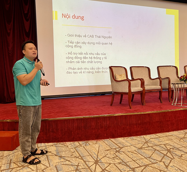 Các đại biểu được các đại diện đến từ các tỉnh đã triển khai mô hình CAB gồm Hải Phòng, Thái Nguyên, Bình Dương chia sẻ kinh nghiệm thành lập, quản lý, điều phối nhóm CAB; kinh nghiệm và kết quả cải thiện chất lượng dịch vụ tại cơ sở từ các sáng kiến của CAB; kinh nghiệm trong việc tiếp cận, xây dựng mối quan hệ với cộng đồng…