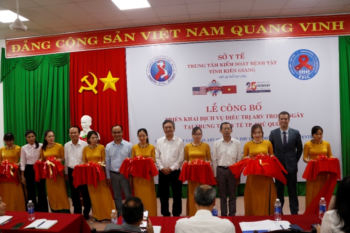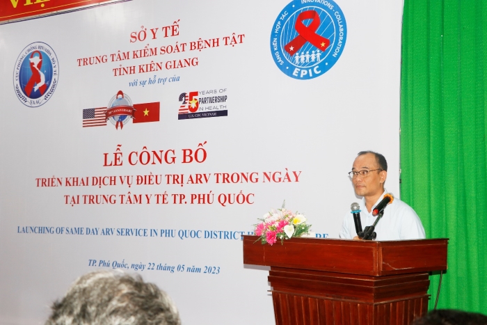 Phát biểu khai mạc buổi lễ, ông Châu Sơn Thuận, đại diện Sở Y tế tỉnh Kiên Giang đã chia sẻ về tình hình dịch HIV/AIDS tại tỉnh Kiên Giang, trong đó số lượng nhiễm mới ngày càng gia tăng và có diễn biến phức tạp trong các nhóm đối tượng kể từ năm 2017. Tuy nhiên được sự hỗ trợ kỹ thuật của Cục Phòng, chống HIV/AIDS, các nhà tài trợ, dịch vụ điều trị ARV trong ngày đã được đưa vào triển khai tại Rạch Giá và TP. Phú Quốc. Đại diện Sở Y tế tỉnh Kiên Giang cũng gửi lời cảm ơn đến Cục Phòng, chống HIV/AIDS, Tổ chức CDC Hoa Kỳ tại Việt Nam, Dự án EPIC đã luôn đồng hành, hỗ trợ kinh phí và kỹ thuật để thành phố Phú Quốc có thể triển khai được dịch vụ điều trị ARV trong ngày, đem lại hiệu quả thiết thực cho người nhiễm HIV nói riêng và cho chương trình phòng chống HIV/AIDS tại tỉnh Kiên Giang nói chung.