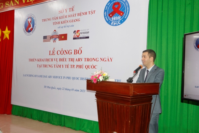 Phát biểu tại Lễ công bố, TS Eric Dziuban đã gửi lời chúc mừng tới tỉnh Kiên Giang đã quyết tâm, hiện thực hóa hoạt động điều trị, lấy người bệnh làm trung tâm, chúc mừng Trung tâm Y tế TP. Phú Quốc đã sớm đưa vào triển khai dịch vụ điều trị ARV trong ngày. Việc điều trị trong ngày đã mang lại rất nhiều lợi ích cho người nhiễm HIV nói riêng và cộng đồng nói chung. Việc điều trị trong ngày đã làm giảm đáng kể số lượng bệnh nhân mất dấu, quản lý bệnh nhân tốt hơn và những người bệnh không mất đi cơ hội điều trị. Cùng với Cục Phòng, chống HIV/AIDS, CDC Hoa Kỳ tại Việt Nam và chương trình PEPFAR mong muốn và cam kết hỗ trợ đem lại dịch vụ điều trị toàn diện, hiệu quả, đúng đối tượng cho tỉnh Kiên Giang. Ông cũng nhấn mạnh các hoạt động hợp tác không chỉ dừng ở dịch vụ điều trị trong ngày mà còn sẽ là các hoạt động tìm ca thông qua bạn tình, bạn chích, tìm ca qua mạng xã hội, các dịch vụ xét nghiệm tiên tiến …..và nhiều hoạt động hợp tác khác. Lễ công bố ngày hôm nay là sự kiện quan trọng không chỉ đối với chương trình phòng chống HIV/AIDS quốc gia mà còn đặc biệt quan trọng đối với PEPFAR và CDC Hoa Kỳ.