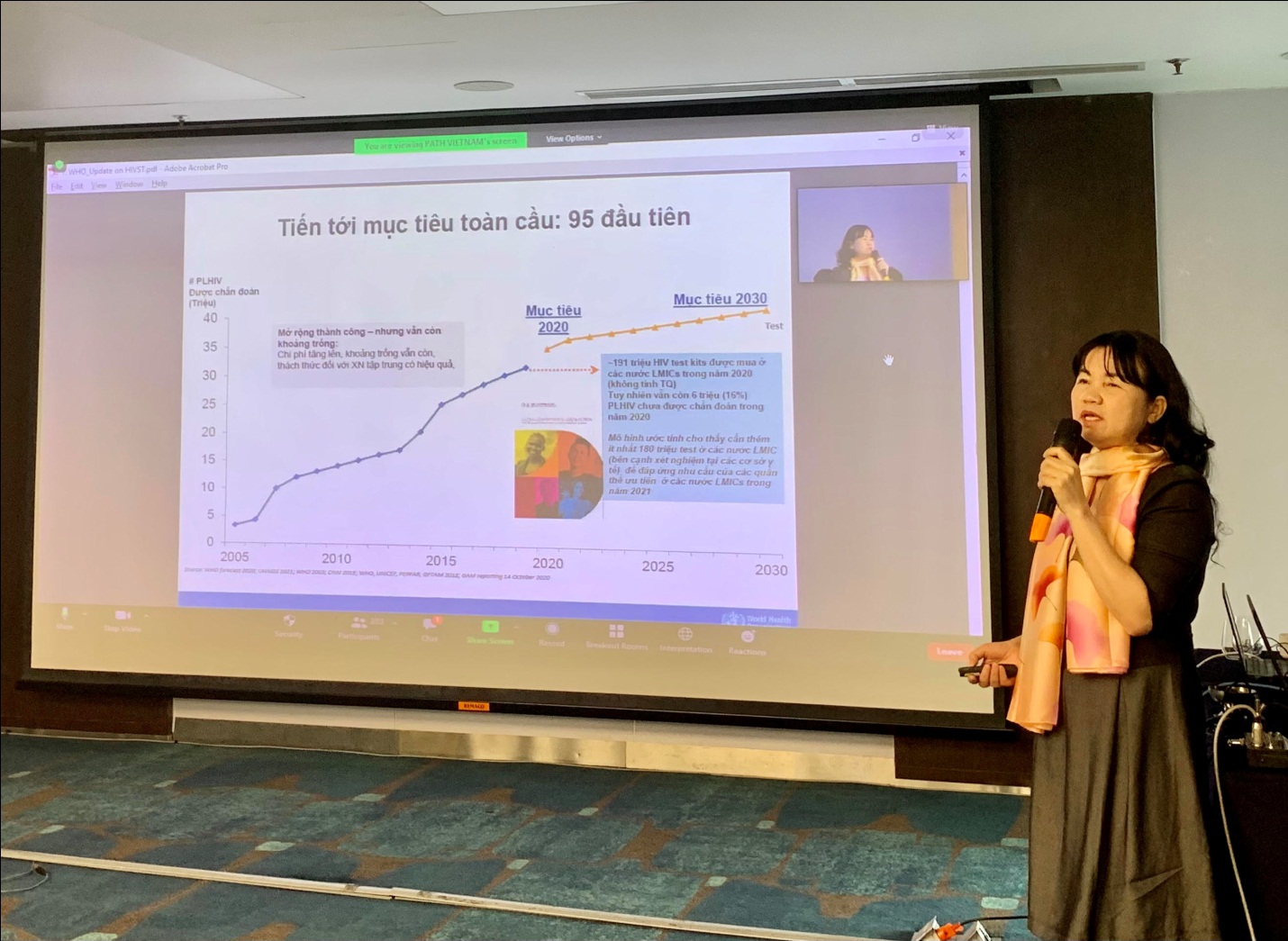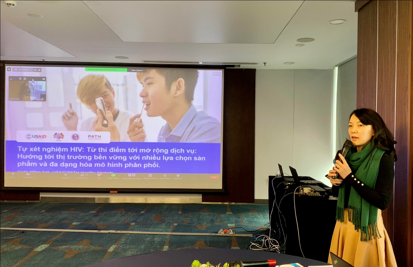 Đại diện Dự án PATH Healthy Market chia sẻ về quá trình thí điểm tự xét nghiệm HIV tới mở rộng dịch vụ hướng tới thị trường bền vững với nhiều lựa chọn sản phẩm và đa dạng hóa mô hình phân phối.