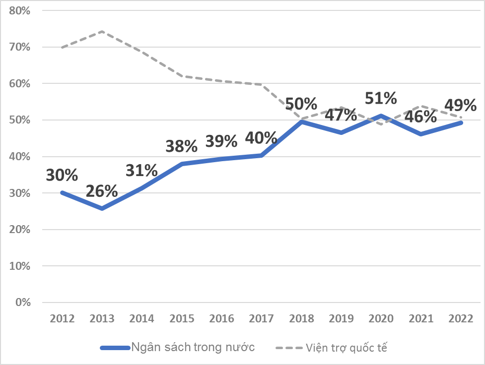 Tỷ trọng ngân sách trong nước và viện trợ quốc tế cho chương trình HIV/AIDS giai đoạn 2012-2022