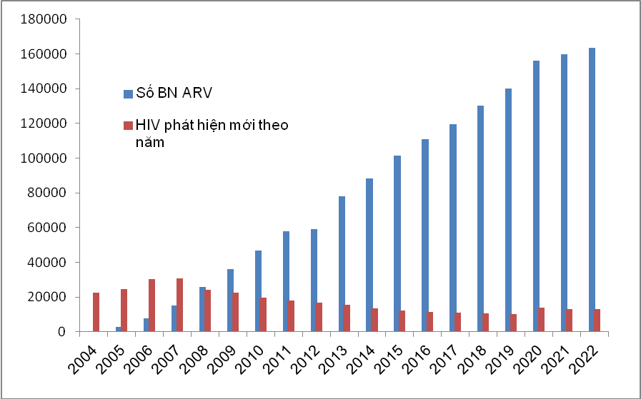 Biểu đồ tăng trưởng bệnh nhân ARV và số nhiễm HIV mới được phát hiện theo năm