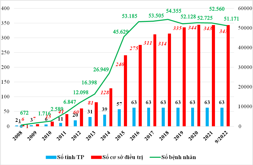 Vào năm 2000, ban đầu mới chỉ có từ 3 đến 5 cơ sở điều trị HIV/AIDS, tuy nhiên đến nay Việt Nam đã có 499 cơ sở. Trong đó, có 8 cơ sở điều trị tại tuyến Trung ương; 77 cơ sở tuyến tỉnh, thành phố; tại 37 trại giam, số còn lại thuộc cơ sở tuyến huyện, tại trung tâm 06, cơ sở tôn giáo và các phòng khám tư nhân.